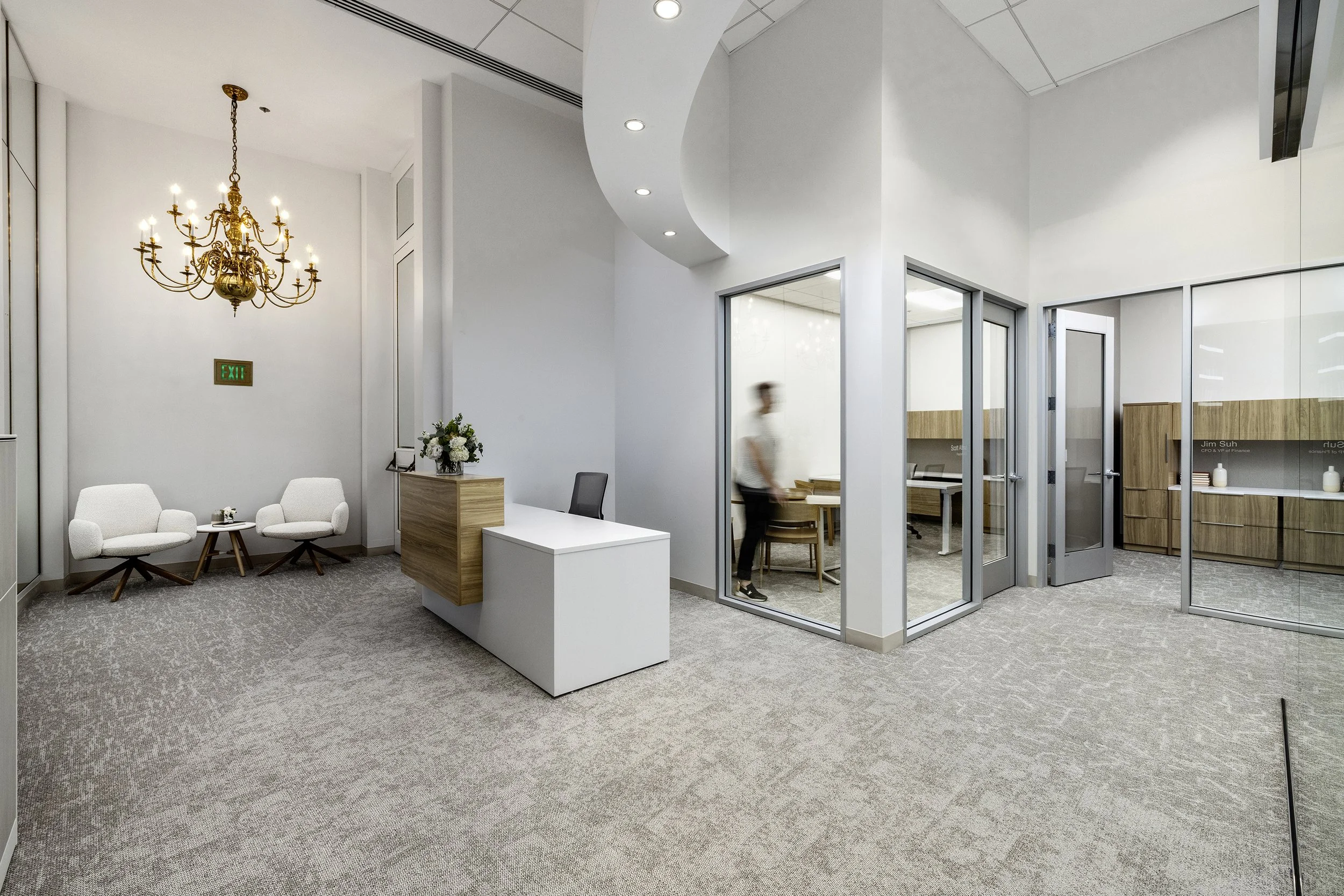 Now, four cantilevered, curved soffits dominate the space. The visual play of materials, walls, and lighting were inspired by the often used half circle shape of the chorale, juxtaposed with the irregular dancing curves of their home venue the Disney Concert Hall just across the street.. From floor to the 14’ ceiling, curves relating to the shape of the building and then lilting away with playful gestures.