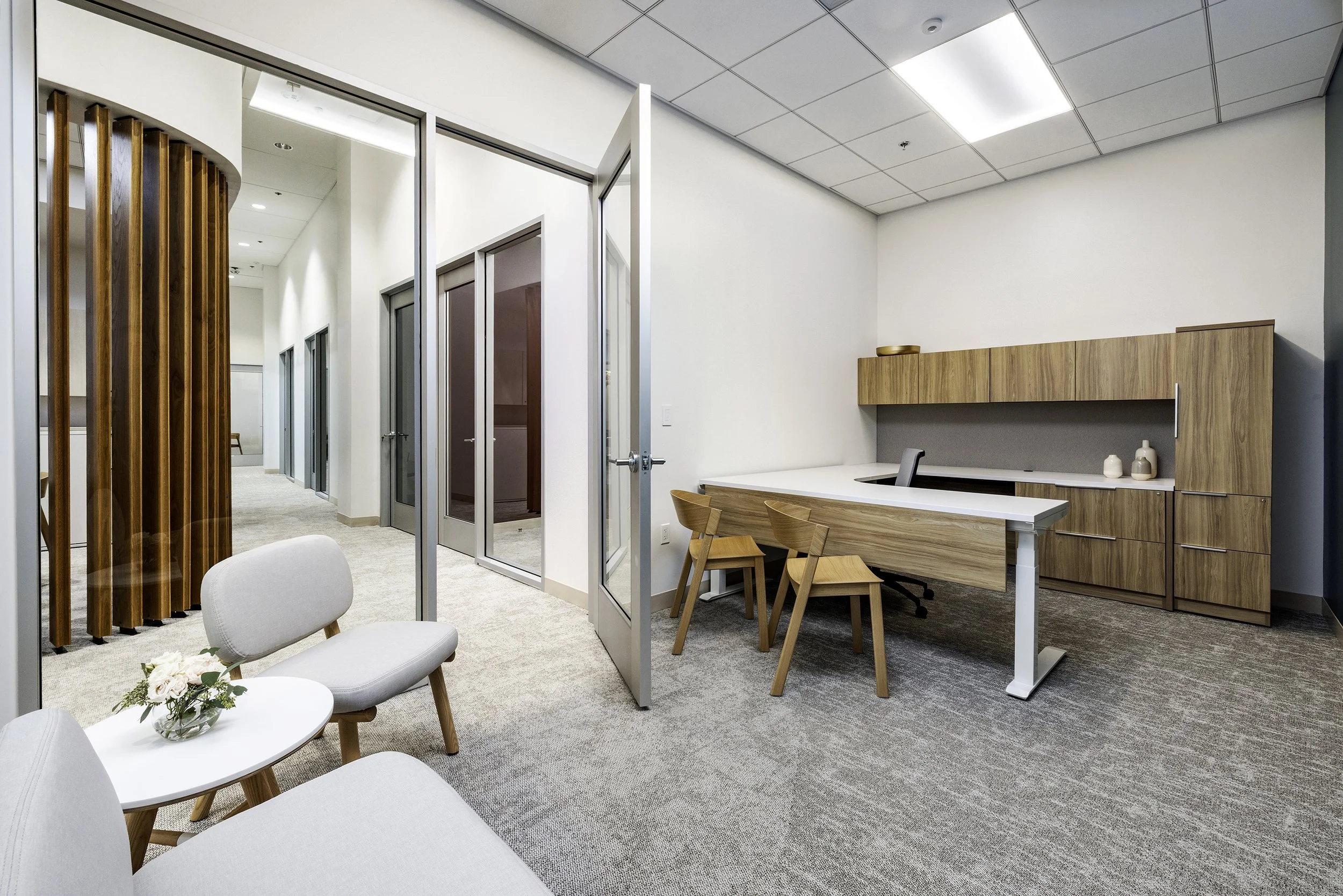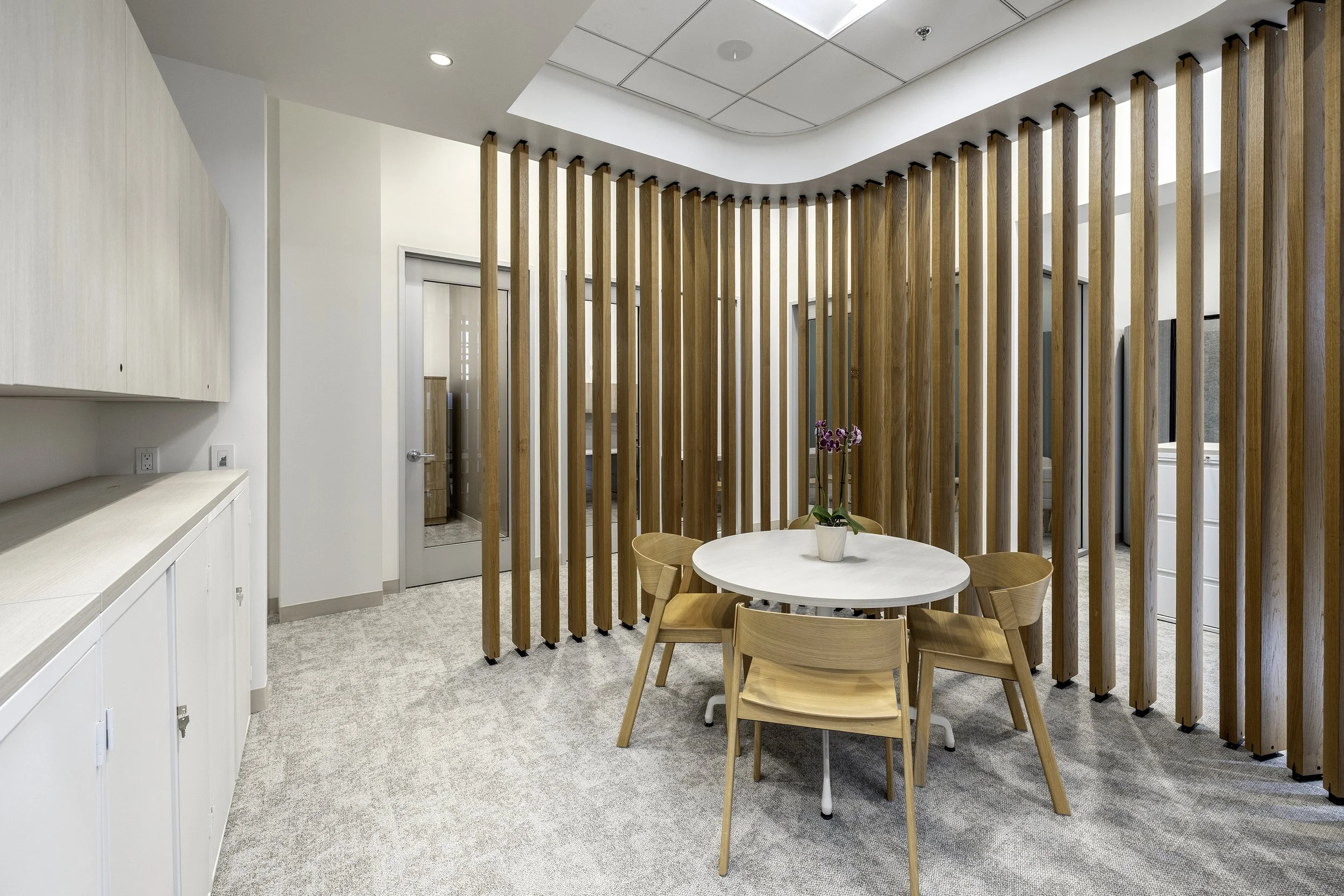 The custom solid white oak wood fins that loosely define the break room and huddle spaces, again give a nod to the half circle chorale, but this time bring in a building column detail seen spanning ground to roof just outside the curtain wall windows–bringing tons of natural light into the entire space, rather than just a few private offices.