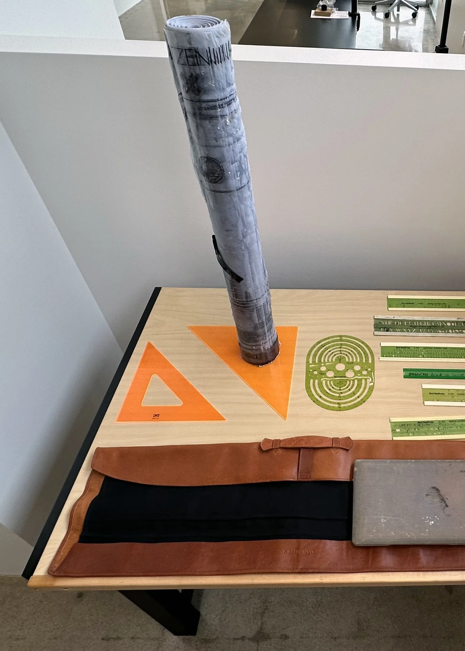 The cylinder is wrapped in Dan Kipper’s leather drawing roll holder. Dan was William’s neighbor growing up in Riverside, second generation surveyor. It was a posthumous gift to William. The backdrop continues with passed on drafting tools from Dan, but also from William’s own father Bernie who was a KC-135 navigator.